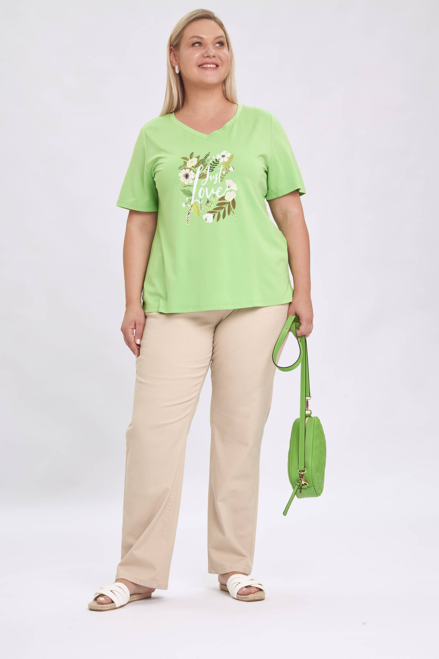 Футболка прилегающего силуэта яркого фисташкового оттенка. V-образный вырез и втачные рукава подчеркнут достоинства фигуры. Модель выполнена из плотного трикотажа с флоральным принтом в комплекте с джинсами в тон из этой же капсулы создаст стильный повседневный образ.