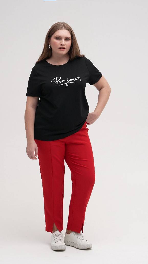 Черная футболка прямого силуэта с круглым вырезом и втачными рукавами, выполненная из вискозного трикотажа. Модель с контрастным текстовым принтом дополнит повседневные образы в сочетании с классическими брюками из этой же капсулы.