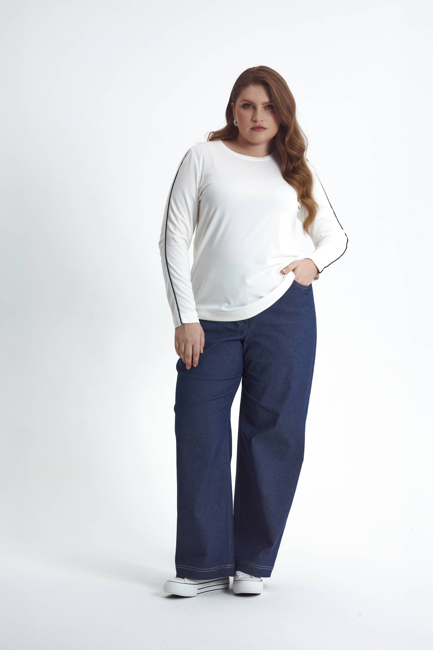 Лонгслив прилегающего силуэта в молочном оттенке из легкой вискозы с добавлением нейлона и эластана. Силуэт подчеркнет круглая горловина и втачные рукава, которые украшает кант синего цвета, добавляющий расслабленности в ваши образы.