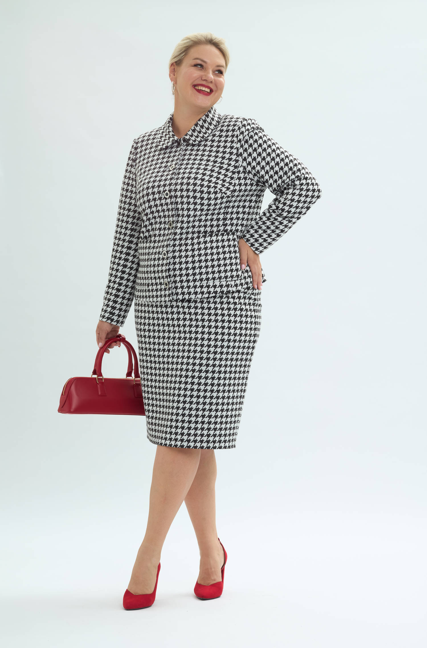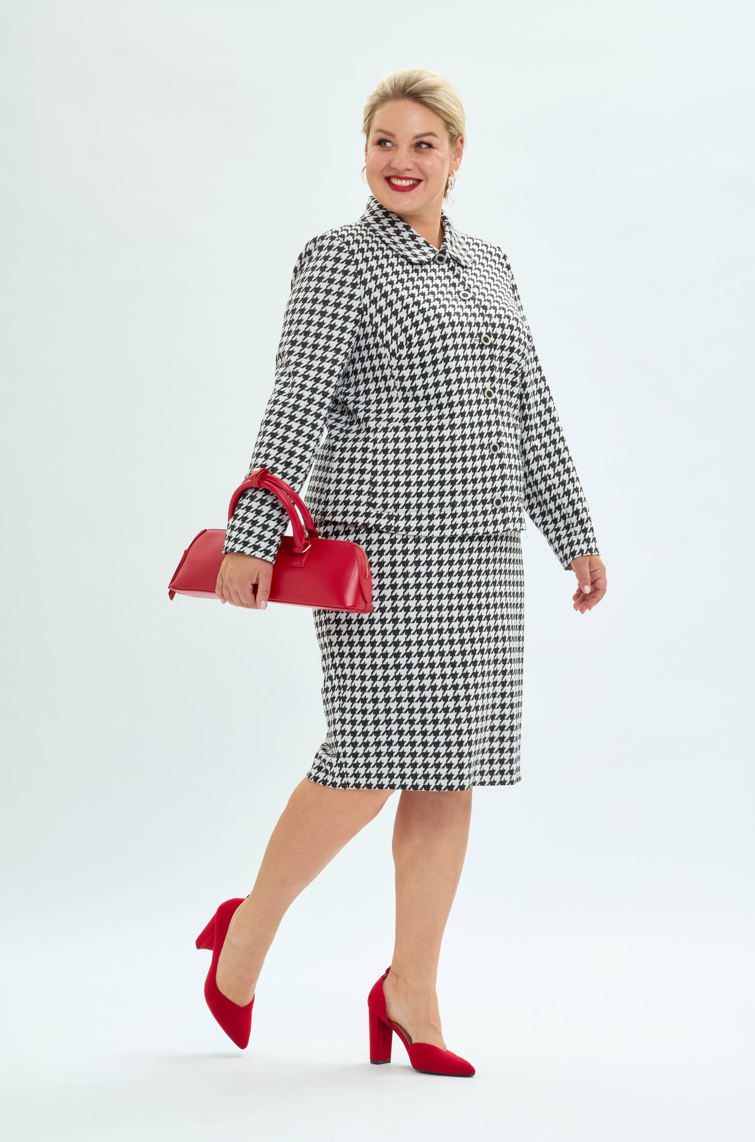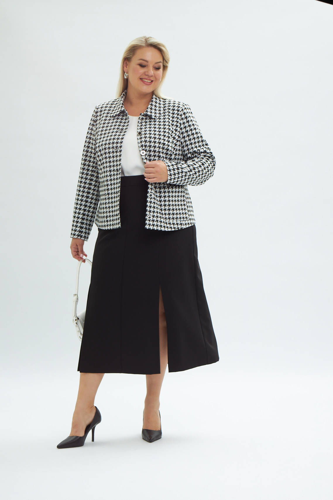 Жакет полуприлегающего силуэта с отложным круглым воротником. По переду рельефные швы и вытачки, накладные карманы круглой формы. Втачные рукава и застежка на металлические пуговицы до верха придают элегантности образу. В комплекте с юбкой в тон из этой же капсулы создает стильный деловой образ.