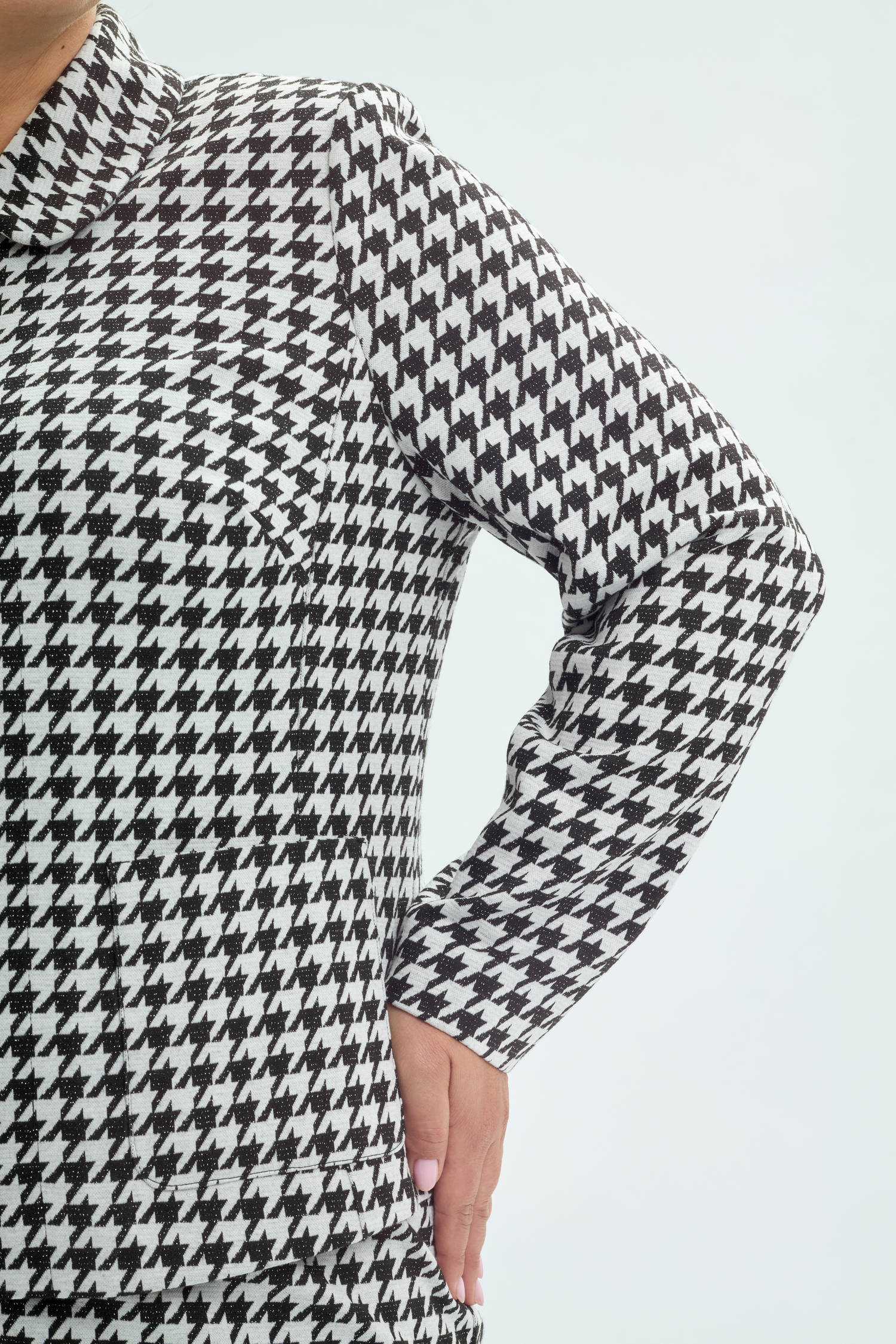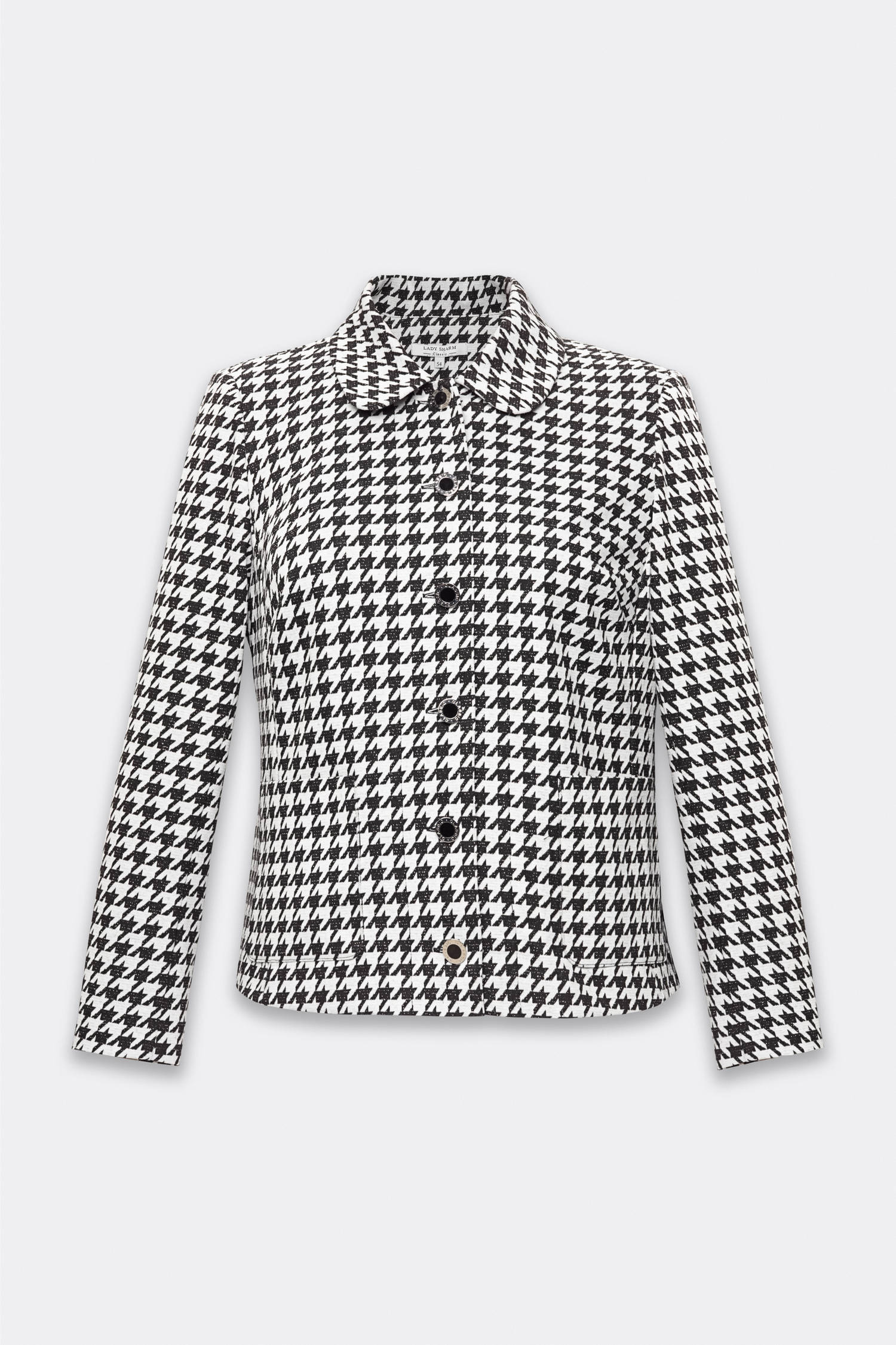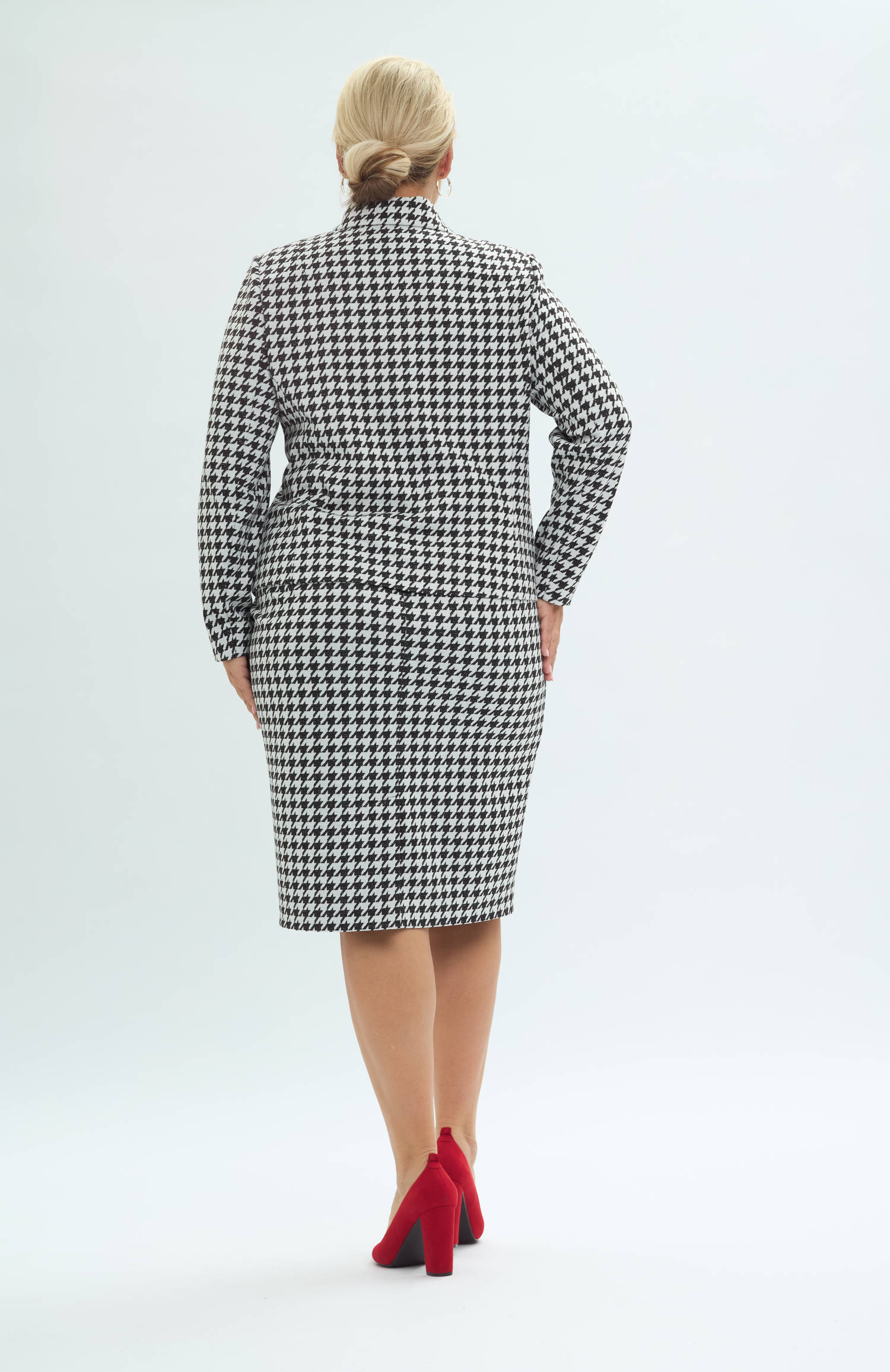 Жакет полуприлегающего силуэта с отложным круглым воротником. По переду рельефные швы и вытачки, накладные карманы круглой формы. Втачные рукава и застежка на металлические пуговицы до верха придают элегантности образу. В комплекте с юбкой в тон из этой же капсулы создает стильный деловой образ.
