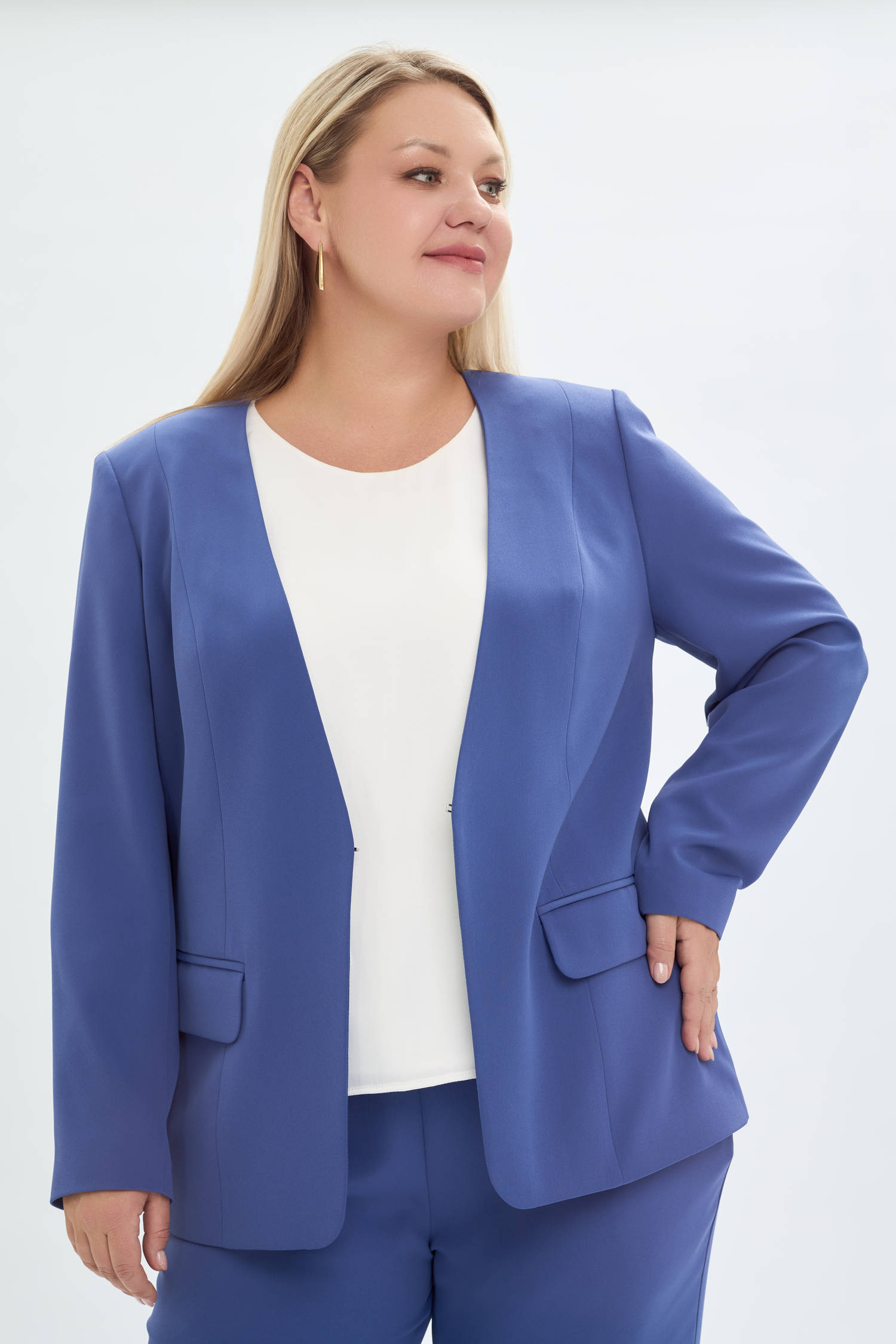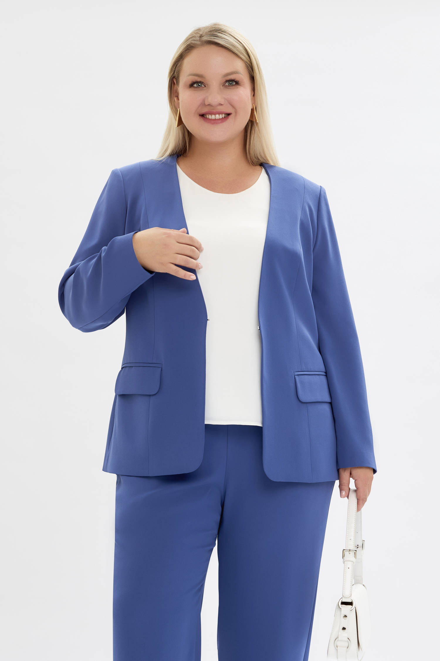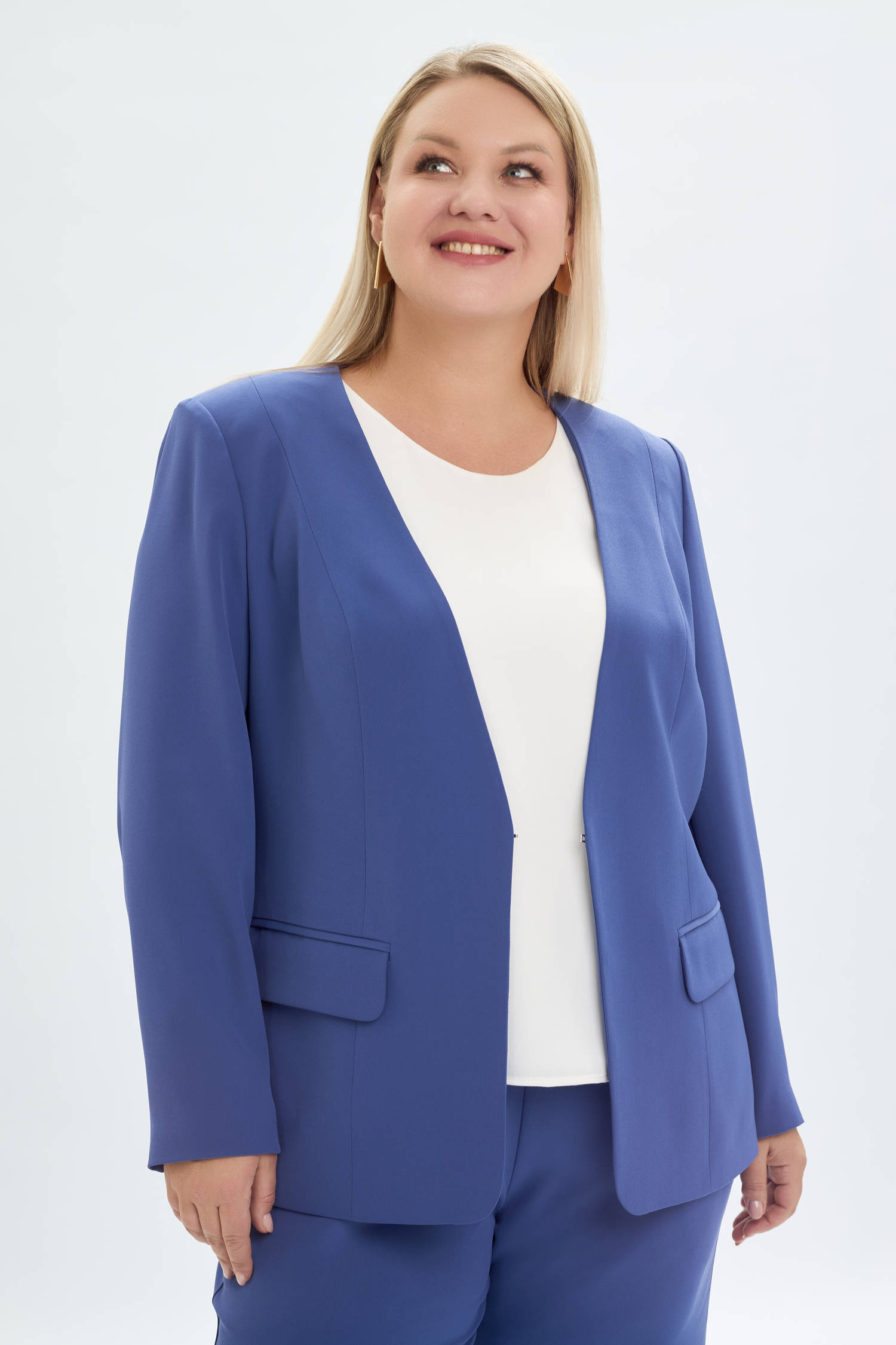 Жакет прямого силуэта с V-образным вырезом без воротника. Втачной двухшовный рукав подчеркнет силуэт. На переде рельефные швы и карманы с клапаном, застежка на один крючок. Сочетайте с брюками в тон из этой же ткани для создания яркого делового образа.