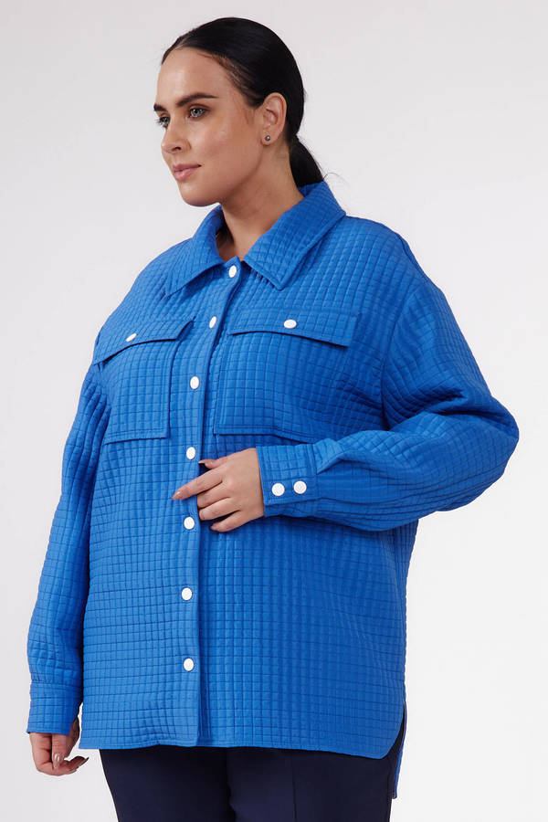 Куртка прямого силуэта на кнопках. Воротник отложной. Втачной рукав со спущенным плечом. Застежка – планка на кнопках. Накладные карманы с клапанами. Фигурные вырезы в боковых швах. Фактура ткани с эффектом стежки. Комбинируйте жакет с футболкой, брюками или джинсами для создания комфортного образа в стиле casual.