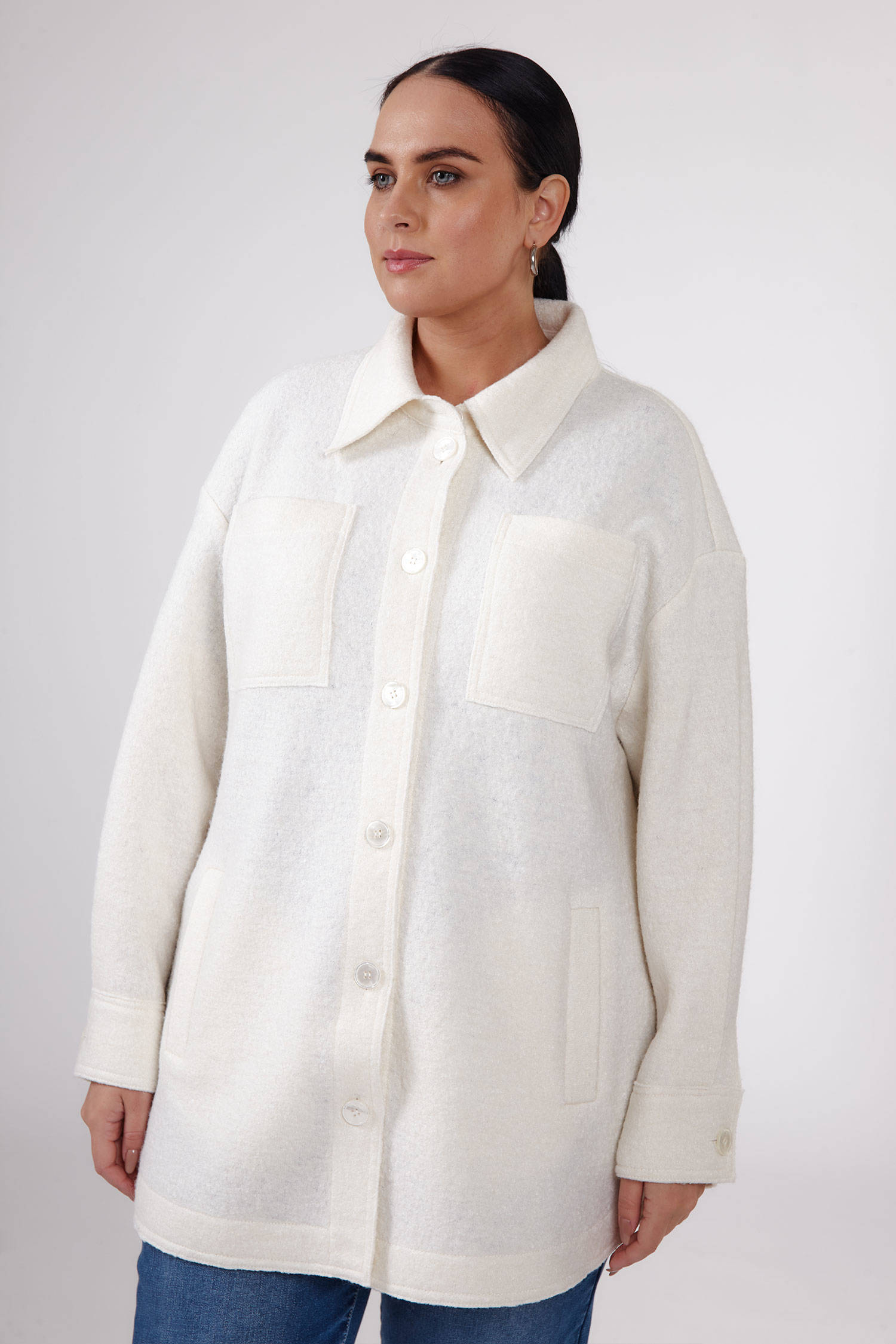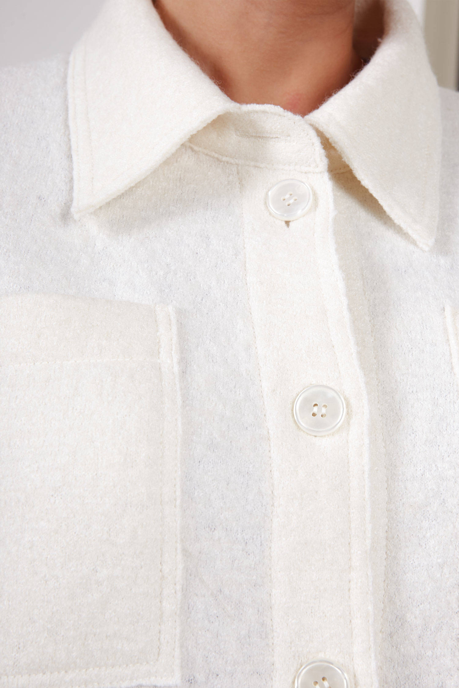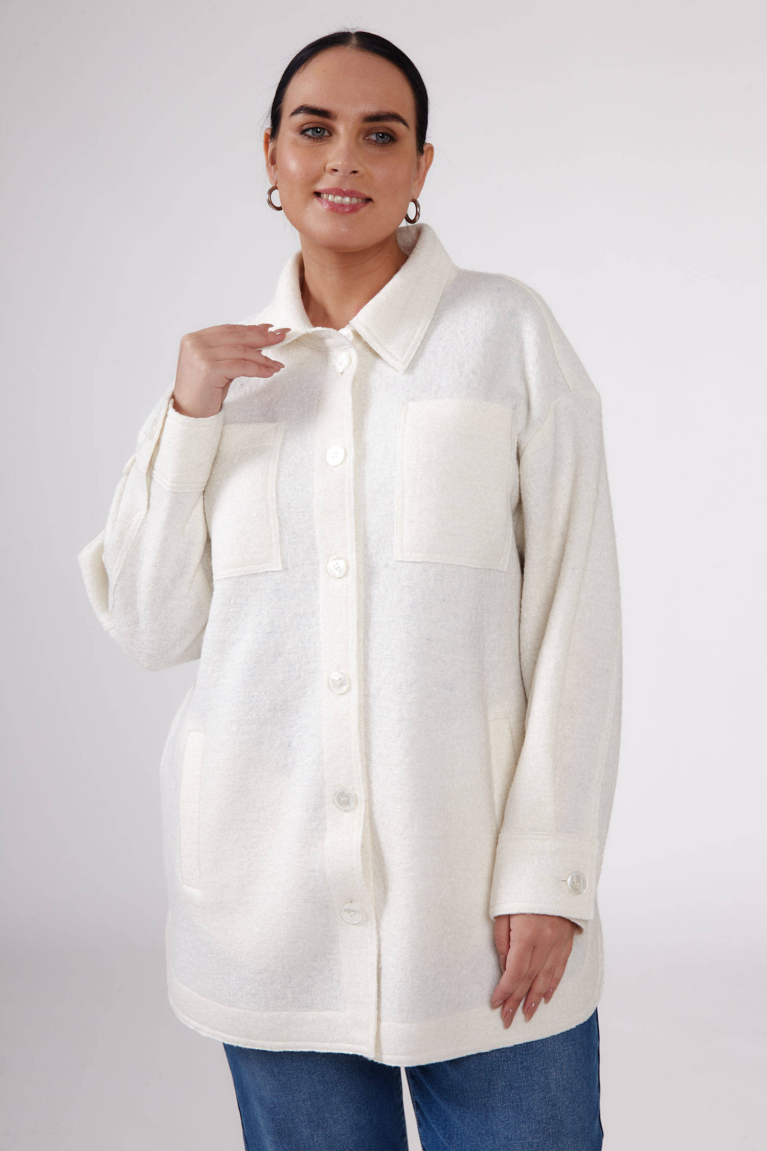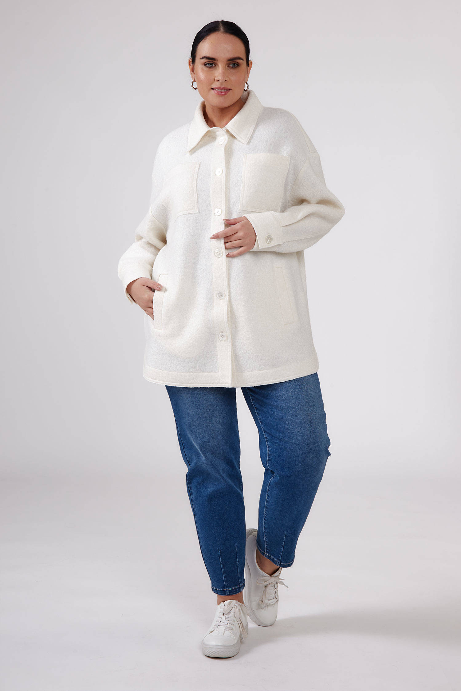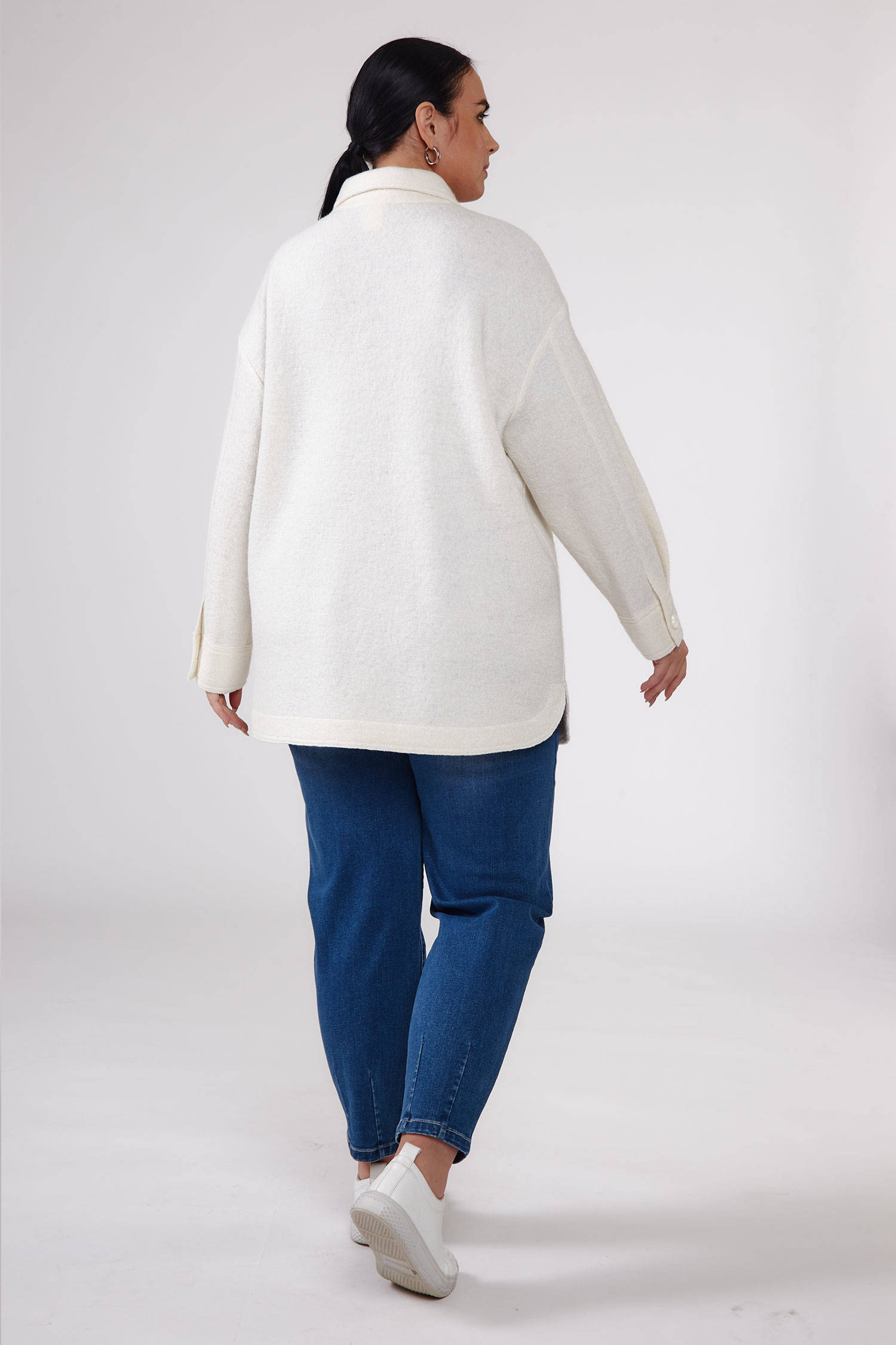 Жакет-рубашка прямого силуэта из вареной шерсти. Воротник отложной со стойкой. Застежка – планка на пуговицах. По переду прорезные карманы с листочками и накладные нагрудные карманы. Спущенное плечо и длинный рукав с манжетой на пуговице. Фигурные вырезы в боковых швах. Модель дополнит повседневный образ в комплекте с брюками или джинсами.