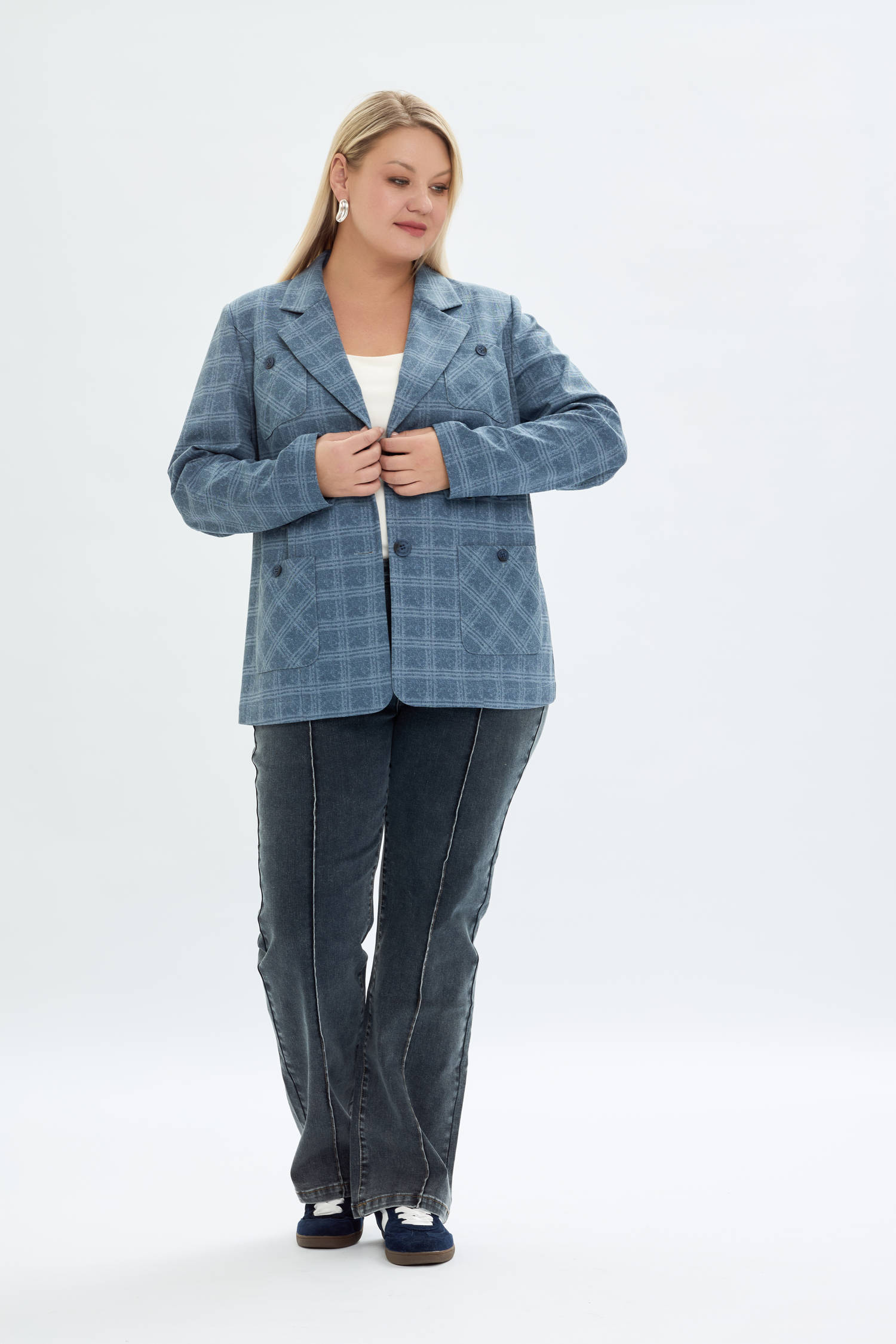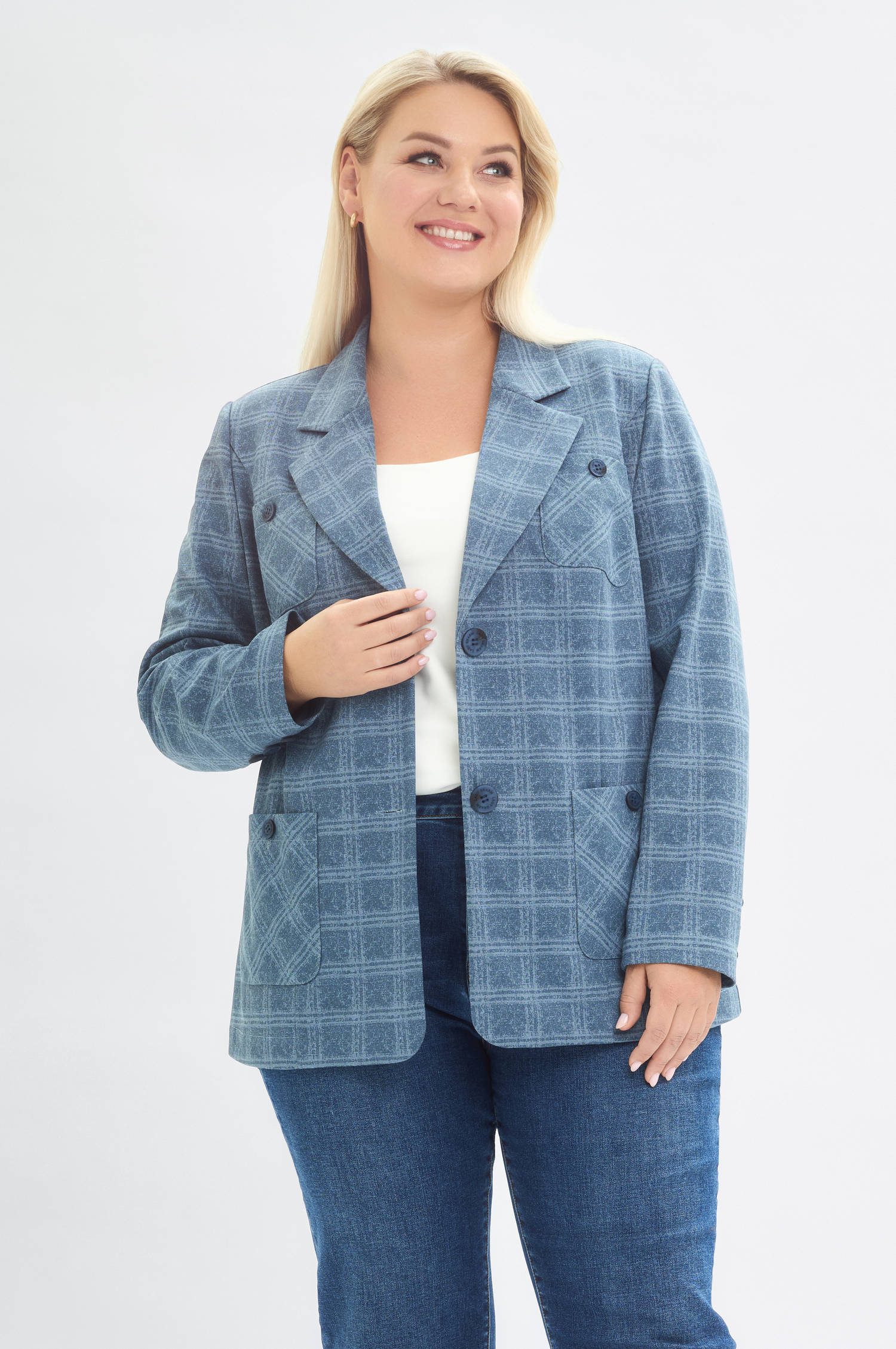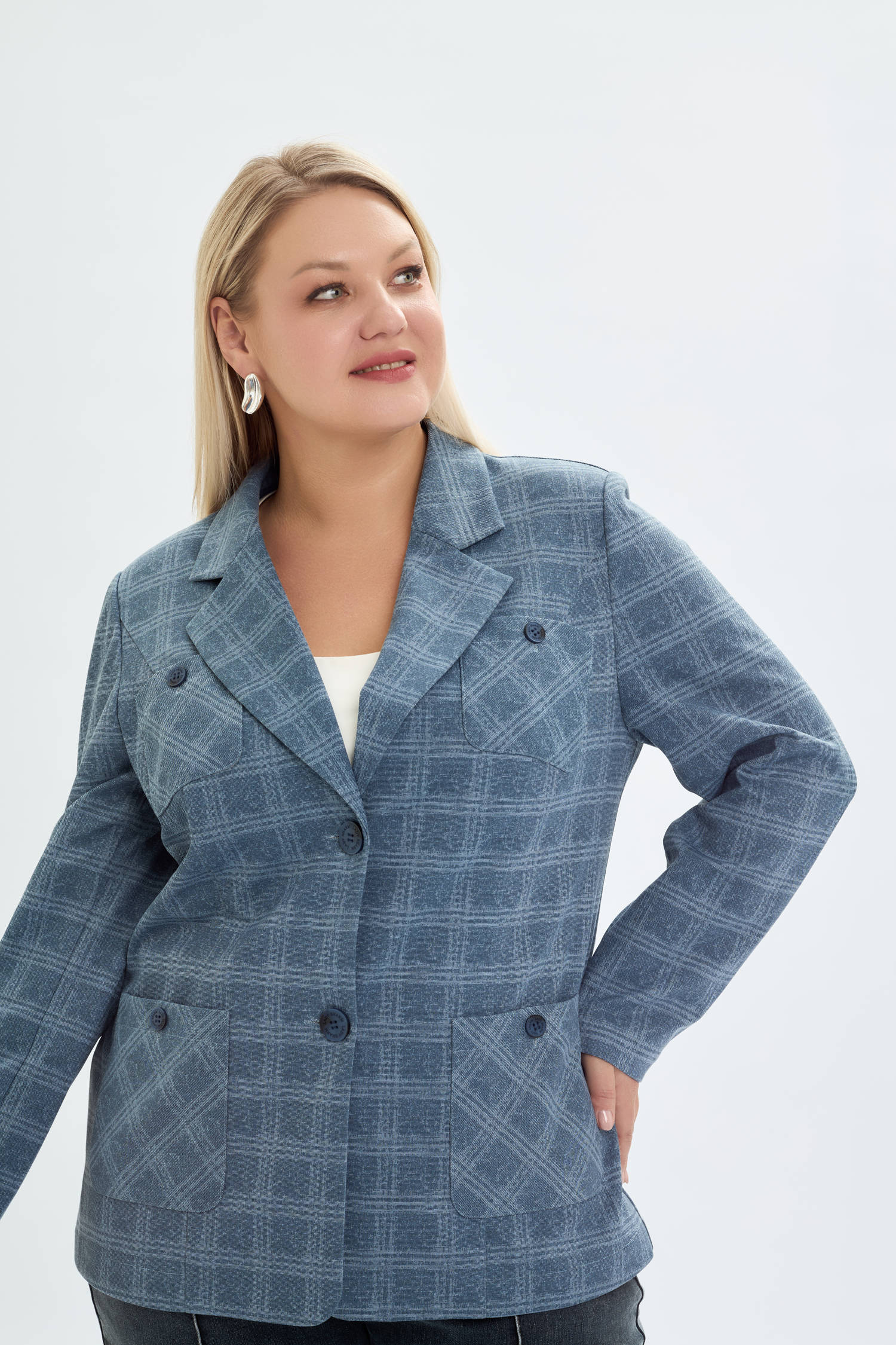 Трикотажный жакет в стиле кэжуал без подкладки. Плотная поливискоза в клетку напоминает деним. Модель прямого силуэта на 2 пуговицы со втачными рукавами дополняется накладными карманами с пуговицами, удлиняя силуэт. Рельефные швы из проймы и английский воротник завершают образ, который отлично сочетается с джинсами из этой же капсулы.