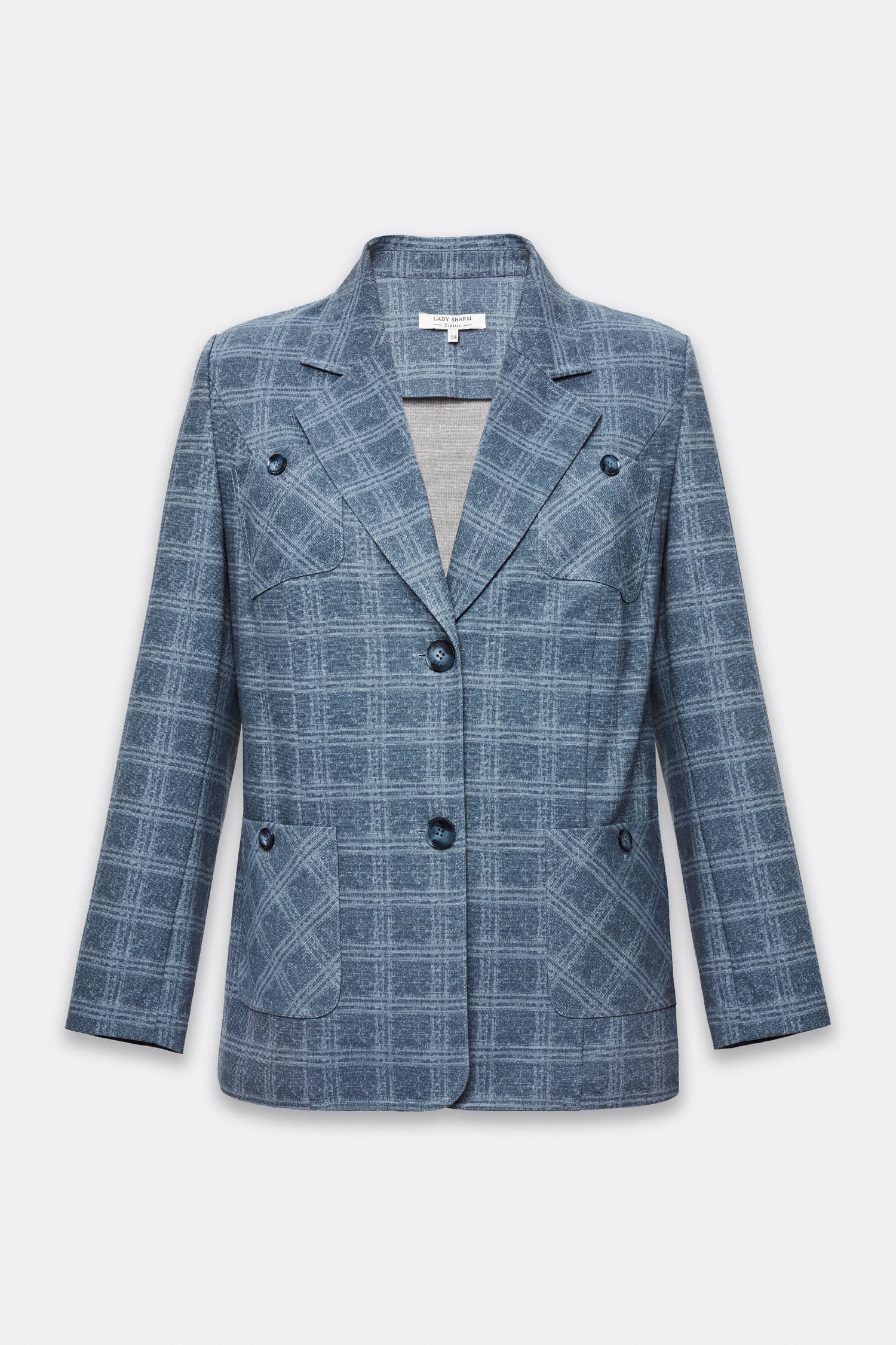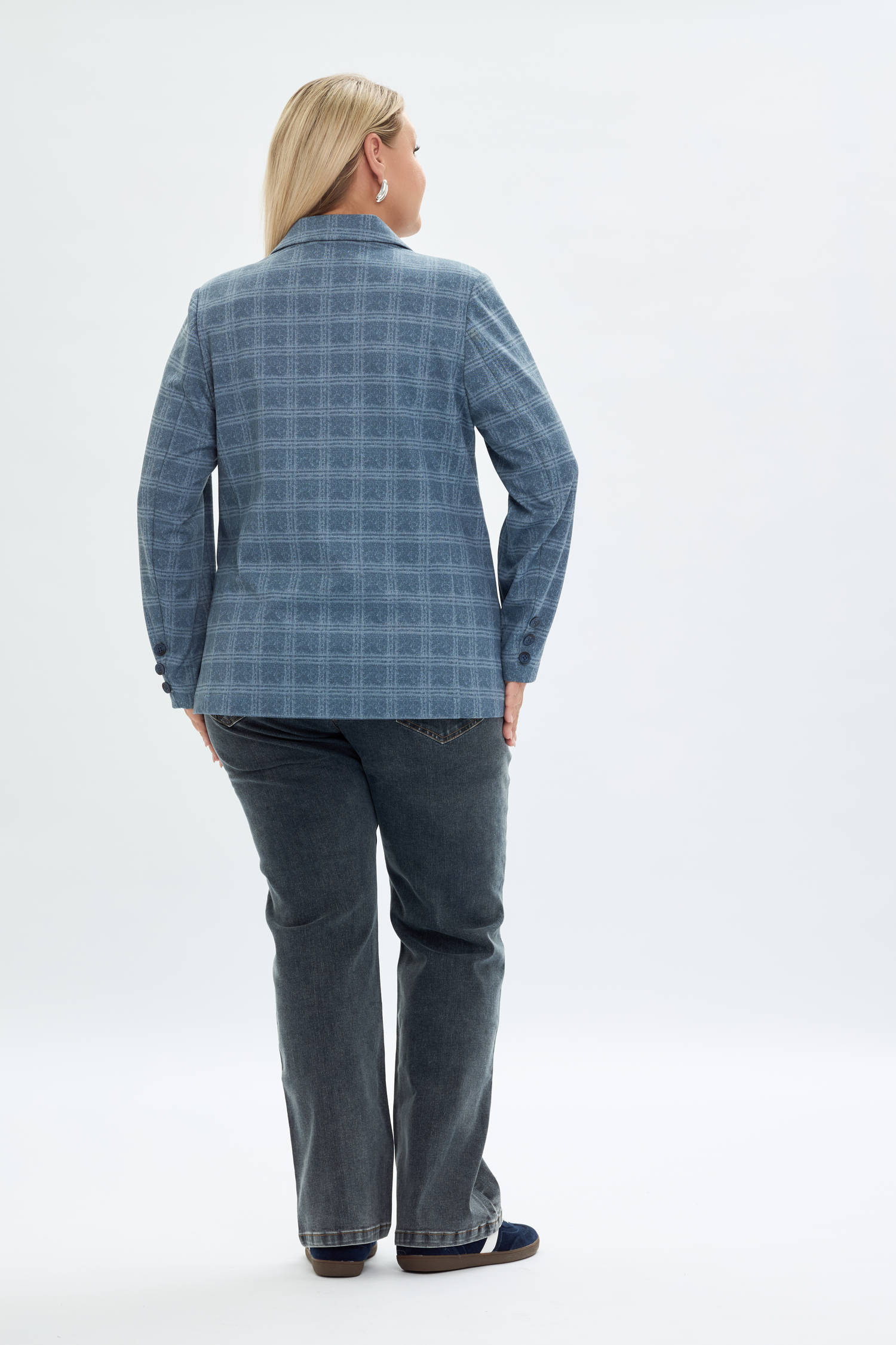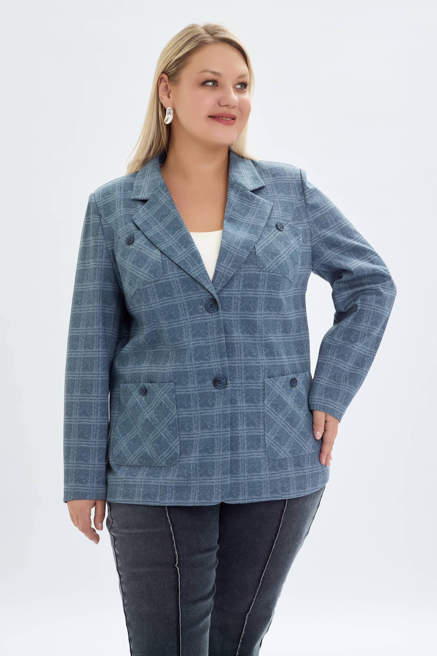 Трикотажный жакет в стиле кэжуал без подкладки. Плотная поливискоза в клетку напоминает деним. Модель прямого силуэта на 2 пуговицы со втачными рукавами дополняется накладными карманами с пуговицами, удлиняя силуэт. Рельефные швы из проймы и английский воротник завершают образ, который отлично сочетается с джинсами из этой же капсулы.